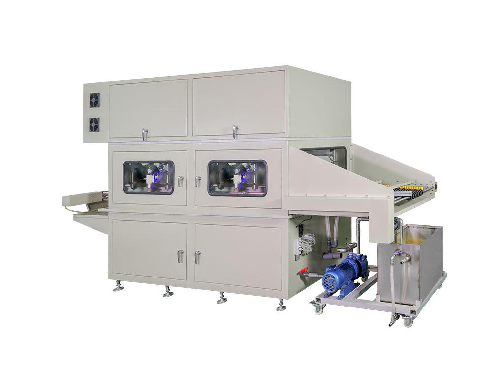 A chanfradeira para retrovisores auto consiste em linhas A/B (duas), 8 sugadores e 16 rebolos, combinando identificação, absorção e transporte, lapidação de bordas, controle, vácuo e sistema de resfriamento. Chanfradura, lapidação fina e chanfradura fina podem ser configurados em cada rebolo, sendo que duas peças de vidro podem ser processadas simultaneamente. Com pequenos ajustes, 4 peças de vidro podem ser processadas ao mesmo tempo.